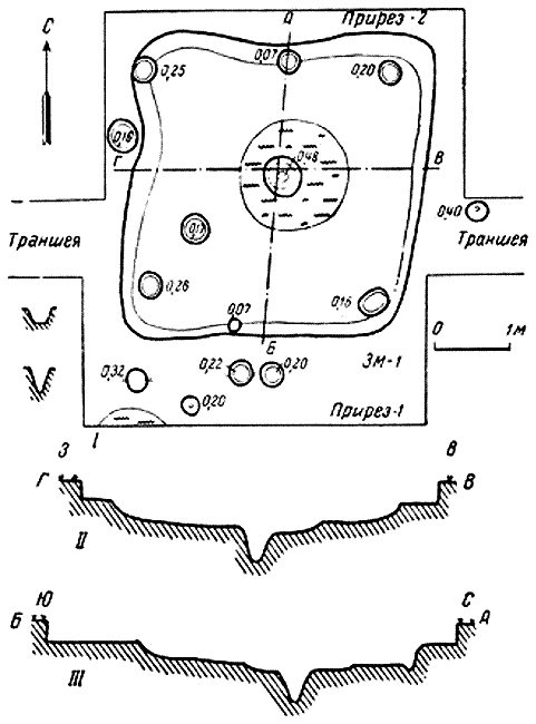 I — план на глубине 0,45-1,10 м от вершины вала; II — план на глубине 1,70-2,20 м от вершины вала; III — план на глубине 2,80-3,30 м от вершины вала.