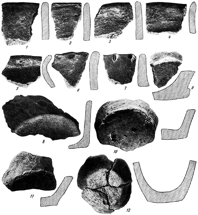 Посуда позднейшего времени, видимо принесенная чуждыми, разорившими городище племенами, также резко отличается своими особенностями от обоих типов горшков середины I тысячелетия н. э., изготовленных из грубой глины с примесью дресвы (рис. 15, 1, 3, 5; 17; 20, 1–5). В заполнении постройки 2 (землянка 2) и возле нее были найдены плечистые горшки и сковородки. Горшки украшены по венчику и по плечикам характерной роменско-боршевской гусеничной орнаментацией или треугольниками, наколотыми на плечиках горшка и восходящими к юхновской системе орнаментации (рис. 15, 4, 6, 7; 20, 6, 7). Примесь шамота в керамике из постройки 2 (землянка 2)