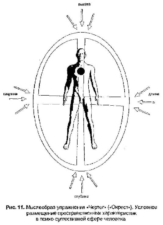 Рекомендуется применять принцип синкинезии – синхронной работы взгляда, дыхания и движения тела. Применительно к упражнению «Окрест»; взгляд устремляется через скрещенные пальцы вдаль, поднимается вместе с руками на вдохе и опускается на выдохе (вспоминайте: вдох – усиление восходящего потока, выдох – усиление нисходящего потока), голова при этом слегка поднимается и опускается соответственно. При разведении рук в стороны глаза так же стремятся к периферии, создавая объемное зрение или, как мы говорим, «концентрацию на пространстве». Казалось бы, несовместимые понятия – «концентрация» и «пространство». Но такой подход дает возможность объемно воспринимать реальность, обеспечивает подвижность, текучесть сознания. Это приводит к осознанию (то есть интеллектуализации) других, более тонких формаций нашей личности. В частности, энерго-астрало-ментального фантома нашего грубого тела. Мы видим на рис. 11, что крыльям Креста соответствуют четыре характеристики пространства. К высоте, длине и ширине добавляется глубина. А ведь наше сознание привыкло к трехмерному восприятию. Вот и получается, что упражнение «Чертог», или «Окрест» (южно-русская традиция), является еще и мистическим ключом, открывающим подход к осознанию себя в 4-м энерго-информационном пространстве. Упражнение «Чертог» целесообразно выполнять однократно, без повторений, но с максимальной концентрацией части сознания на образе «окрещенной сферы».