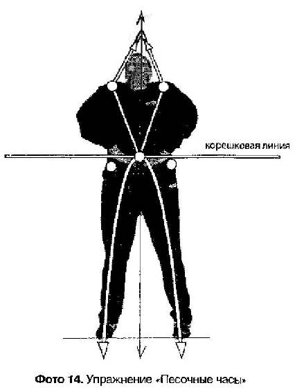 Цель упражнения – научиться разделять тело на 2 сектора – верхний и нижний, относительно горизонтальной пупочной линии (линии отсчета движения в дальнейшем мы будем называть корешковыми). Оно оказывает явный терапевтический и энергонаполняющий эффект. Вы приобретаете навык одновременно тянуть верхнюю половину тела к небу и укоренять нижнюю в землю. Это, в свою очередь, обеспечивает разглаживание и мягкое растяжение мышц и связок, поддерживающих позвоночный столб от первого грудного позвонка до копчика, а также слегка снимает нагрузку на межпозвонковые гиалиновые хрящи.