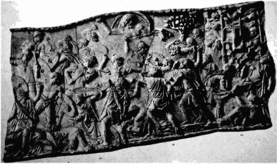 Рис. 11. Битва «античных» римлян с даками. Слева — римляне, справа даки. Наверху — «античный» бог Зевс, помогающий римлянам. Согласно нашей реконструкции подобные «античные» изображения стали появляться уже в эпоху Реформации, в XVI–XVII веках. Подлинные древние изображения были совсем другими. Фрагмент изображения войн Траяна с даками на столпе Траяна в итальянском Риме. Фотография XIX века. Взято из книги: Conrad Cichorus «Die Reliefs der Traianssaule», Berlin, Verlag von Georg Reitner, 1900