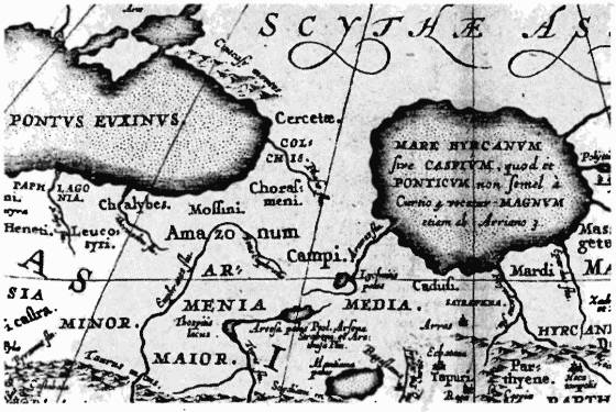 Рис. 15.Увеличенный фрагмент предыдущей карты с обозначением Мидии (MEDIA), Великой Армении (ARMENIAMAIOR) и Амазонии (Amazonum) между Черным и Каспийским морями