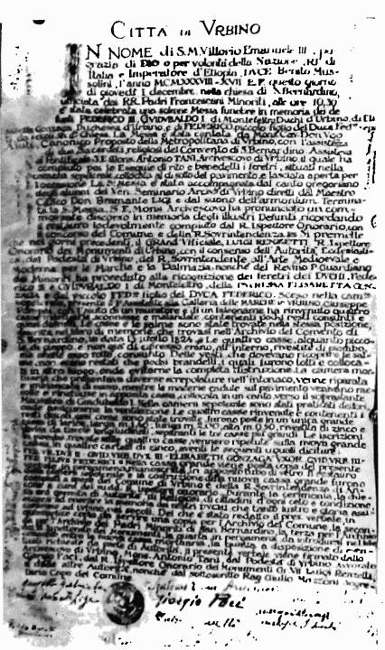 Рис. 43. Указ Муссолини 1938 года от имени итальянского короля об историческом значении городе Урбино и реставрационных работах. Фрагмент предыдущей фотографии. Переснято нами в 2007 году