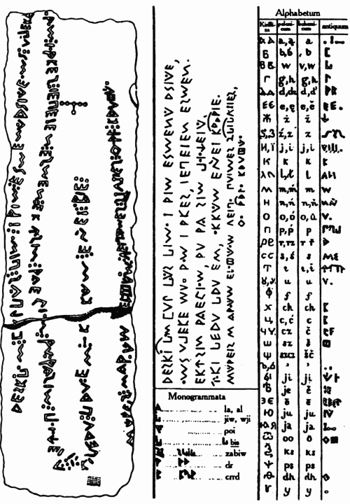 Этрусская азбука приведена на рис. 62 в самом правом столбце. Предыдущие три столбца показывают соответствие этрусских букв с привычной нам КИРИЛЛИЦЕЙ (первый столбец), ПОЛЬСКИМИ буквами (второй столбец) и БОГЕМСКИМИ буквами (третий столбец). Сложные буквы, представляющие из себя сочетание нескольких букв, изображены в таблице внизу слева. Кстати, в кириллице тоже были сложные буквы: я = иа, ю = иу, кси, пси и т. д.