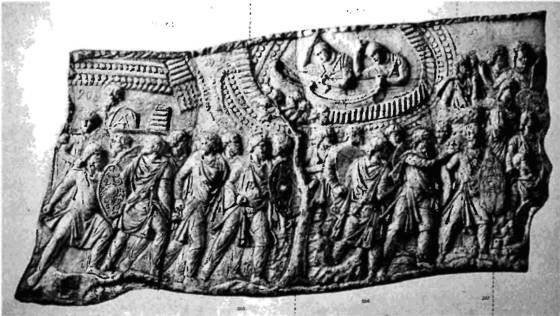 Рис. 7. Воины и летописцы. Летописцы, отгороженные от событий, напряженно думают, как бы написать «правильную» историю. Изображение на столпе Траяна в Риме. Фотография XIX века. Взято из книги: Conrad Cichorus «Die Reliefs der Traianssaule», Berlin, Verlag von Georg Reimer, 1900