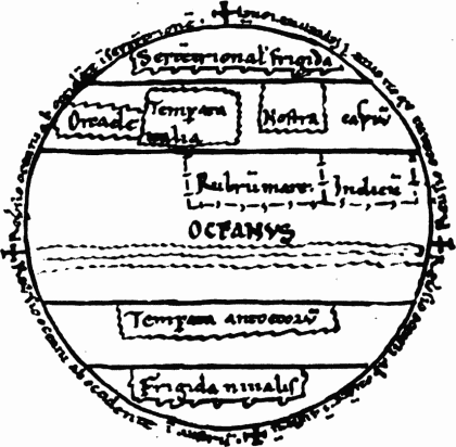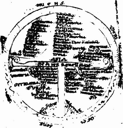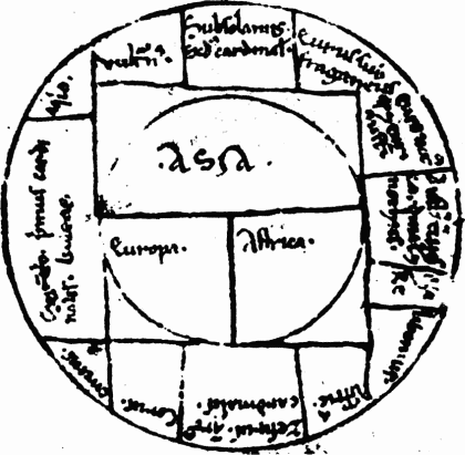 Рис. 87. Скандинавская карта якобы XII века. Обратите внимание, что мир разделен на три части — Азию, Европу и Африку — христианским Т-образным крестом. Взято из [523], с. 116