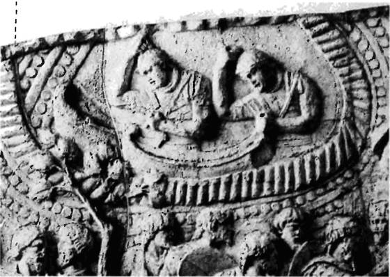 Рис. 7. Воины и летописцы. Летописцы, отгороженные от событий, напряженно думают, как бы написать «правильную» историю. Изображение на столпе Траяна в Риме. Фотография XIX века. Взято из книги: Conrad Cichorus «Die Reliefs der Traianssaule», Berlin, Verlag von Georg Reimer, 1900.