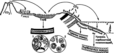 Рис. 14. Схема формирования каустобиолитов и карбонатных пород в биосфере: 1 — организмы — сапропелеобразователи; 2 — карбонатные организмы