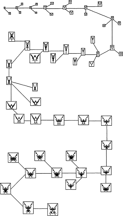 Однако, начиная играть с только что написанной программой ЭВОЛЮЦИЯ, я и вообразить не мог, насколько далеко. Первое, что меня удивило, — это то, как быстро мои биоморфы перестали быть похожими на деревья. Исходное раздваивание ветвей никуда не делось, но оказалось, что его можно с легкостью завуалировать многократным пересечением линий, образующим сплошные цветовые пятна (иллюстрации, увы, только черно-белые). На рисунке 4 показана одна конкретная история эволюционных преобразований, продолжавшаяся
