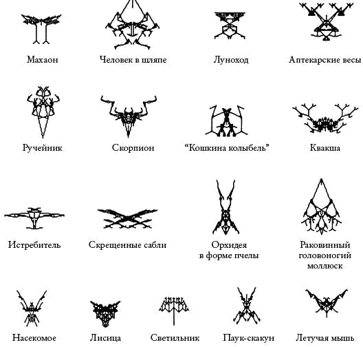 Существуют и продаются компьютерные игры, в которых игроку кажется, будто он блуждает по подземному лабиринту, имеющему определенную, хотя и сложную, географию, и встречает там драконов, минотавров и прочих сказочных противников. Эти чудовища не слишком разнообразны, и все они, так же как и сам лабиринт, были разработаны человеческим разумом программиста. В эволюционной игре — как компьютерной, так и реальной — у игрока (или у наблюдателя) тоже создается впечатление, что он, образно говоря, бродит по лабиринту разветвленных коридоров, но только количество возможных маршрутов практически бесконечно, а монстры, встречающиеся на пути, непредумышленны и непредсказуемы. Когда я скитался по закоулкам Страны биоморф, мне попадались жаброногие рачки, храмы ацтеков, окна готических соборов, наскальные изображения кенгуру, а однажды — памятный, но не желающий воспроизводиться случай — вполне приемлемая карикатура на теперешнего уайкхемовского профессора логики. На рисунке 5 представлены еще некоторые трофеи из моей коллекции, все полученные одним и тем же способом. Хочу подчеркнуть: эти изображения — не плод фантазии художника. Никогда и никоим образом их не дорисовывали и не подправляли. Они именно такие, какими их вычертил компьютер, внутри которого они эволюционировали. Роль человеческого глаза сводилась только к тому, чтобы выбирать