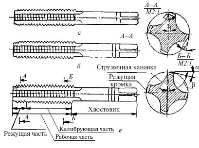 Элементы метчика: рабочая часть, состоящая из режущей и калибрующей частей, и хвостовик. На рабочей части нанесены спиральная нарезка и продольные канавки для удаления стружки. Режущие кромки получаются на пересечении спиральной нарезки и продольных канавок для удаления стружки. Хвостовая часть заканчивается квадратной головкой для установки в патрон. Метчики изготавливают из углеродистой инструментальной стали У12 и У12А, быстрорежущей стали Р12 и Р18, легированной