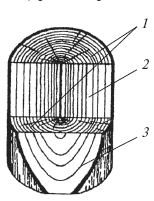 Рис. 1. Основные разрезы ствола дерева: 1 – поперечный; 2 – радиальный; 3 – тангентальный