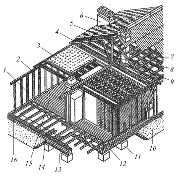 Раму каркаса собирают на бойке в горизонтальном положении и при сборке поднимают в вертикальном положении краном. В двухэтажных зданиях рамы для каркаса бывают двух видов: собираемые на высоту одного этажа и собираемые на высоту двух этажей. В домах с рамами, собираемыми на один этаж, балки междуэтажного перекрытия опираются на обвязки рам, а в рамах, собираемых на два этажа, – на врезанные в стойки каркаса доски на ребро.