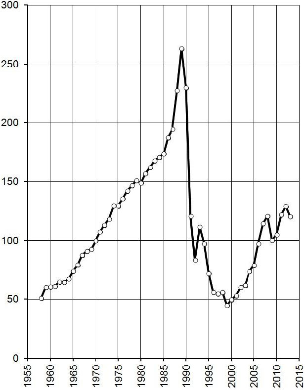 Рис. 3. Индекс инвестиции в «человеческий капитал» (1970 = 100)