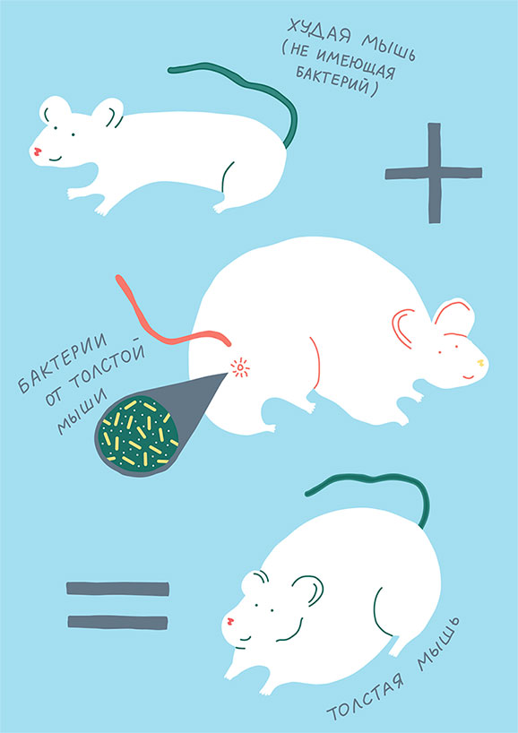 о чем все чаще говорят ученые. Мы получаем все больше подтверждений тому, что огромную роль в ожирении играют микробы. Нормального размера мышь, свободная от бактерий, после пересадки ей фекального микробного материала от толстой мыши сама набирает вес. Причем это происходит во всех случаях, независимо от того, обусловлено ли ожирение мыши-донора перееданием [51] или генетической мутацией [52] .51