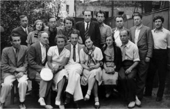 Съёмочная группа фильма «Профессор Мамлок». Второй слева с белой фуражкой в руке в первом ряду художник П. В. Бетаки, третий слева во втором ряду режиссёр Герберт Рапопорт.