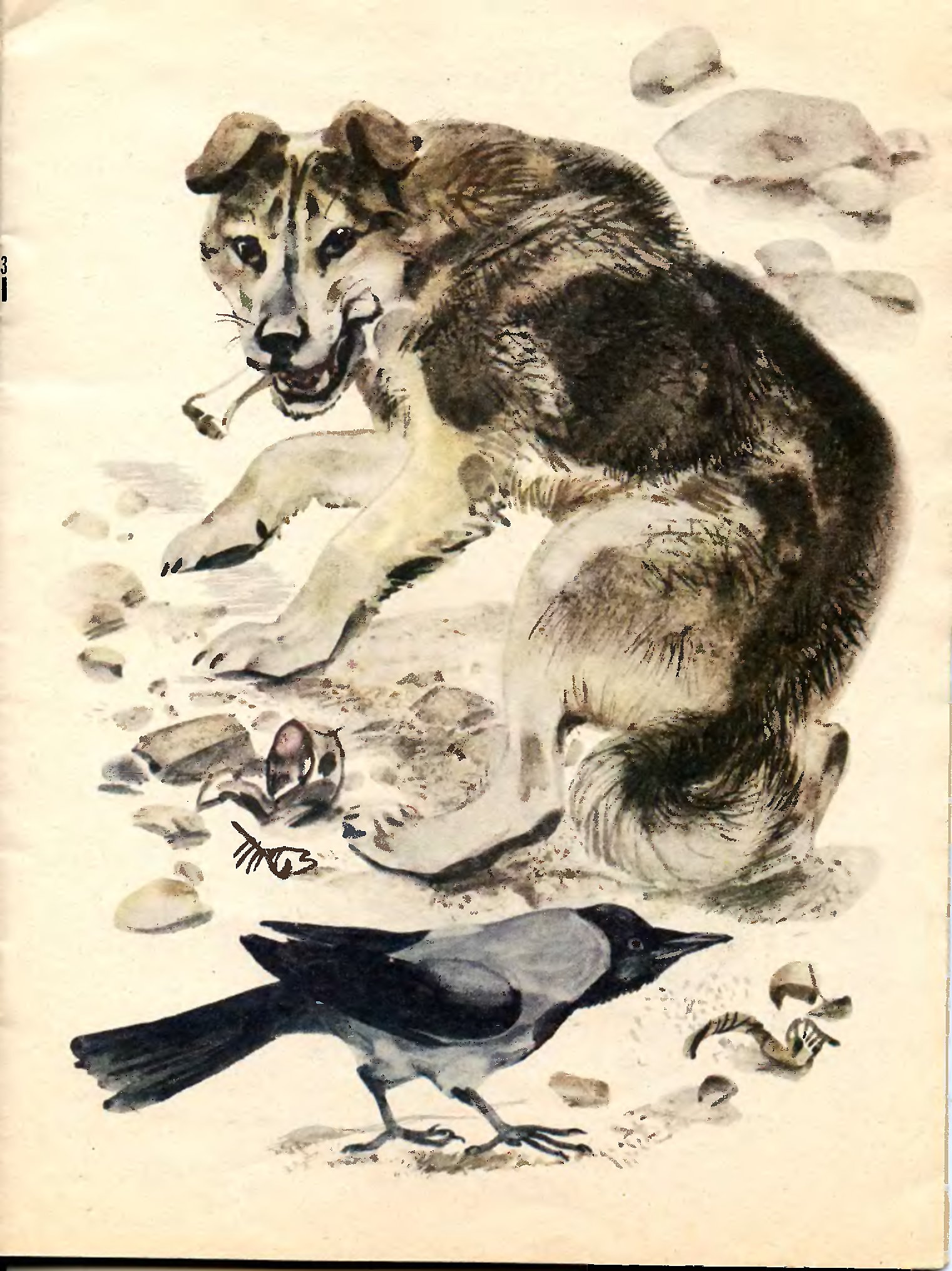 Але й воронам сподобалося качине м'ясо. Вони — за собакою. Одна над головою крутиться, зазирає в очі — от-от виклюне око! А друга