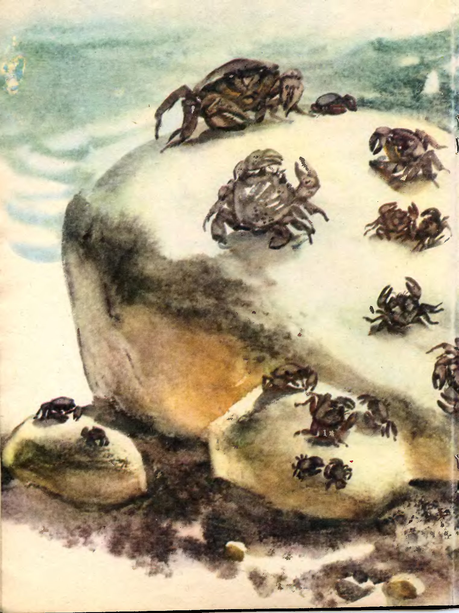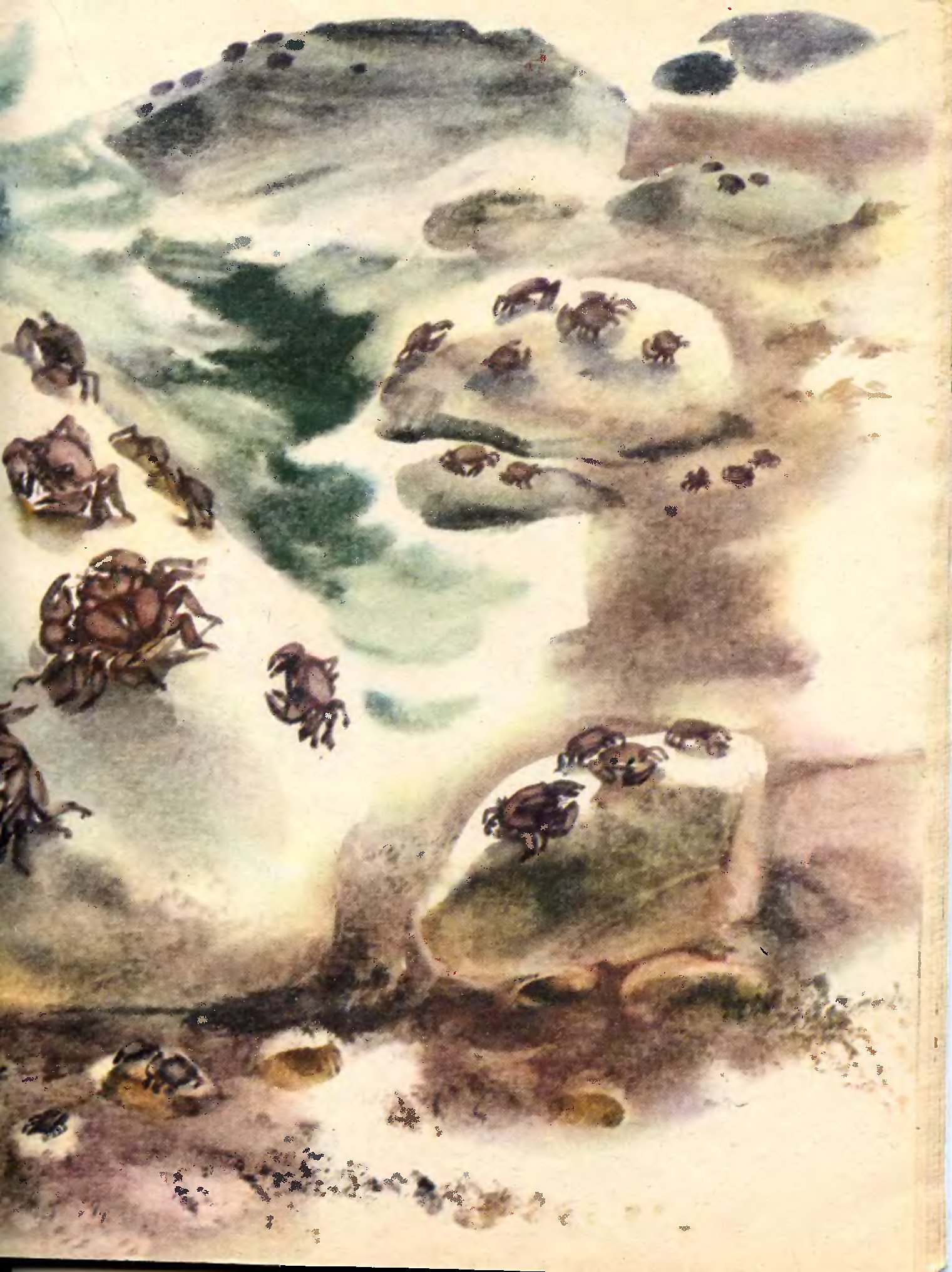 Це були краби — круглі чорні морські раки. Найбільший з них був з мою долоню завширшки, а найменший був як мідна копійка. їх було дуже багато, багато сотень. Я глянув уздовж берега — скільки міг бачити — усе каміння поспіль було засаджене краб ми. Чимраз нові й нові вилазили із щілин на сухий камінь, плазували боком, ніби чорні ґудзики з ногами й клішнями. Бувало, що вони наштовхувались одне на одного, оступалися, бувало, що й падав якийсь назад під камінь. Але вони плазували мирно, великі не займали малих, тільки кожний хотів перший вилізти на сонечко.