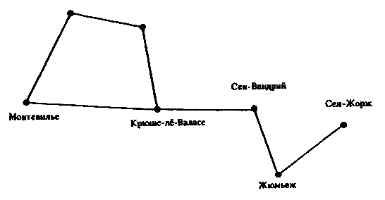 — Я ношу эту схемку вот уже несколько недель. Здесь точно перерисовано взаимное расположение семи аббатств. Как видишь, фигура повторяет очертания Большой Медведицы. Семь аббатств, в которые стекались сокровища Французского королевства, соответствуют семи главным светилам созвездия. Установив это, мы почти вплотную приблизились к цели. Остается сделать лишь один шаг. Межевой камень, так сказать, земной Алькор, должен находиться там же, где Алькор небесный. Поскольку Алькор виден чуть правее центральной звезды Большой Медведицы, то и гранит с кладом должен находиться к востоку от аббатства, занимающего то же место. Это Жюмьеж, в прошлом самое славное и богатое аббатство Франции. Камень стоит там и только там, это математическая аксиома.