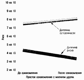 Рис. 8.10.Когда речь идет о таких «дилеммах риска», как дилемма Элен, одного лишь знакомства с мнениями других людей достаточно для того, чтобы позиция индивидуума «сдвинулась» в сторону риска. Что же касается «дилемм осторожности» (примером является дилемма Роджера), знакомство с мнениями окружающих делает людей более осторожными. ( Источник: Myers, 1978)