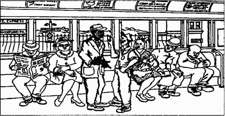 Рис. Б.1. Иногда видишь именно то, во что веришь. Ожидания, соответствующие определенной культурной традиции, влияют на восприятие, на запоминание и на показания. В 1947 г., экспериментально изучая распространение слухов, Гордон Оллпорт и Лео Постман показывали разным людям эту картинку, на которой изображен белый мужчина с лезвием бритвы в руках, и просили их рассказать об этом ещё кому-то, кто должен был рассказать ещё кому-то и так далее. После шести пересказов лезвие оказывалось в руке у чернокожего мужчины. ( Источник: Allport G. W. & Postman L. (1947, 1975)