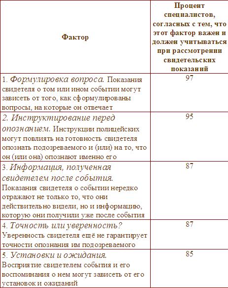 В наши дни для консультаций присяжных нередко приглашают специалистов (обычно это делают адвокаты обвиняемого), задача которых — проверить свидетельские показания. Они информируют присяжных примерно о том же, о чем вы только что прочитали, и эти знания должны помочь им оценить показания свидетелей защиты и обвинения. В табл. Б.1, составленной на основании результатов опроса 63 специалистов по свидетельским показаниям, перечислены те факторы, влияющие на свидетельские показания, которые признаны важными большинством экспертов и должны учитываться при их рассмотрении в зале суда.
