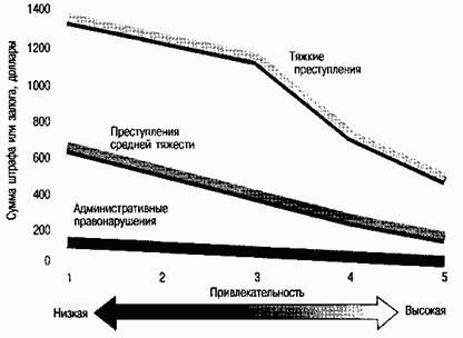 Рис. Б.5. Внешняя привлекательность и судебные решения. Подсудимым с менее привлекательной внешностью судьи с северного побережья Мексиканского залива (штат Техас) назначают более высокие штрафы и залоговые суммы. ( Источник: Downs & Lyons, 1991)