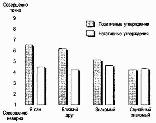 По данным Джоэла Джонсона и его коллег, участники их экспериментов следующим образом оценивали лестные характеристики (например, такую: «ему (ей) нетрудно быть откровенным и убедительным»): 1) как не очень соответствующую их случайным знакомым; 2) как более соответствующую их друзьям и 3) как ещё более соответствующую им самим. ( Источник: Johnson et al., 1985)