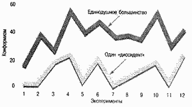 Представьте себе, что вы участвуете в эксперименте по конформизму, все участники которого, отвечавшие до вас, за исключением одного, дали неверный ответ. Окажет ли пример этого помощника-нонконформиста такое же раскрепощающее воздействие на испытуемых, какое наблюдалось в экспериментах Милгрэма но подчинению? Результаты ряда экспериментов свидетельствуют о том, что человек, разрушающий единодушие группы, одновременно подрывает и её социальное влияние (Allen et al., 1955; Morris & Miller, 1975). Как показано на рис. 6.5, если хотя бы один человек рискует высказать собственное мнение, испытуемые едва ли не всегда «озвучивают» свое. Участники подобных экспериментов нередко потом говорят, что испытывали к своему союзнику-нонконформисту теплые и дружеские чувства, однако отрицают его влияние: «Даже если бы его не было, я все равно