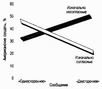 провели две радиопередачи, в которых утверждали, что война на Тихом океане продлится как минимум два года (Hovland, Lumsdaine & Sheffield, 1949). Одна из них была «односторонней»: в ней не были представлены аргументы оппонентов, в частности и такой, что воевать придется не с двумя противниками, а только с одним. Вторая передача была «двусторонней»: в ней прозвучали как аргументы оппонентов, так и ответы на них. Как показано на рис. 7.5, эффективность сообщения зависит от слушателя. «Односторонняя» передача произвела наибольшее впечатление на тех, кто уже и так придерживался этой точки зрения, а «двусторонняя» — на тех, кто был не согласен с ней.Рис. 7.5. Зависимость влияния информации, учитывающей мнение оппонентов и не учитывающей его, от изначального мнения слушателя. После победы над Германией во Второй мировой войне на американских солдат, сомневавшихся в мощи Японии, наибольшее воздействие оказало «двустороннее» сообщение, в котором излагались аргументы в поддержку этой позиции и против нее. Те же солдаты, которые считали войну с Японией серьёзным испытанием, под влиянием «одностороннего» сообщения укрепились в своем мнении. ( Источник: Hovland, Lumsdaine & Sheffield, 1949)
