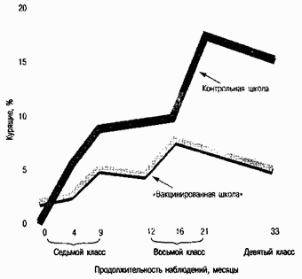 Рис. 7.11.Процент курильщиков среди «вакцинированных» учащихся средней школы значительно ниже, чем среди учащихся контрольной школы, использующей более традиционную программу профилактики курения. ( Источник: McAlister et al., 1980; Telch et al., 1981)
