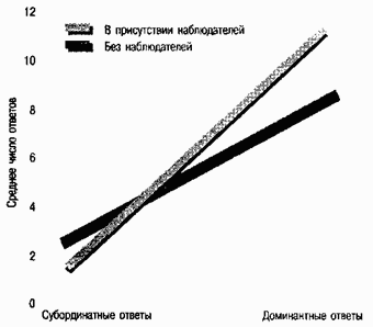 Рис. 8.1. Социальная фасилитация доминирующей реакции. В присутствии наблюдателей испытуемые чаще «видели» доминантные слова (те, которые они произносили 16 раз) и реже — субординатные слова, т. е. те, которые они произносили не более одного раза. ( Источник: Zajonc & Sales, 1966)