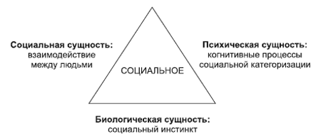 Сущность социального проявляется в трех видах. Первый вид – социальный инстинкт, основанный на биологической природе человека. Второй вид – социальное взаимодействие, которое имеет психическую природу и реализуется на трех стадиях. Две крайние стадии представлены внутренними психическими процессами, а промежуточная – внешними символическими. Третий вид – социальная категоризация как способ познания с помощью процессов классификации и типизации окружающих людей и самого себя.