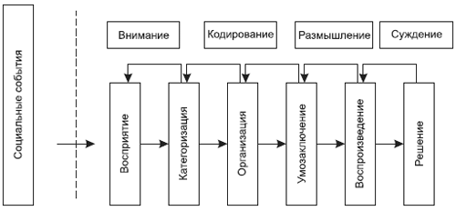 Когнитивных психология предлагает нам более простую морфологическую схему понимания социальных ситуаций людьми. Эта схема универсальна и отражает процесс переработки любой информации, а не только социальной, связанной с поведением и отношениями людей, однако прогностическая значимость позволяет использовать ее и в социальной психологии. Немецкий психолог Клаус Фидлер (К. Fiedler, 1988) предлагает следующую схему последовательности операций:Рис. 5.2. Концептуальная структура когнитивных стадий переработки информации (193, с. 160)