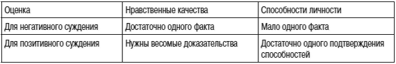 Г. Ридер и М. Бревр сравнивали умозаключения о человеке в связи с негативным поведением в двух сферах: нравственности и способностей. Если речь идет об оценке нравственности человека, то негативная информация (например, о его лживости) приводит к умозаключению о нечестности. Если же человек демонстрирует позитивное поведение (говорит правду), то для подтверждения честности требуются повторное наблюдение или индукция (от дополнительных фактов к гипотезе). Это значит, что в сфере нравственности схема умозаключений для позитивного суждения требует более сильных и весомых доказательств, а для негативного достаточно одного факта (139, с. 168).