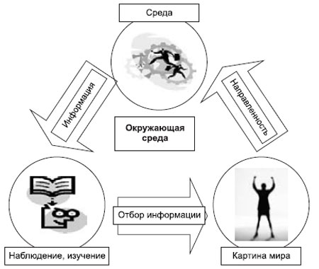 Процесс формирования социальных представлений зависит от многих факторов. Однако, так или иначе, они складываются у индивида под воздействием разнообразных влияний окружающего социального и природного мира, а также особенностей личности и ранее сформировавшихся представлений. На рис. 8.1. показана когнитивная модель формирования социальных представлений. Природная и социальная среда постоянно продуцирует информацию, которая избирательно воспринимается и усваивается человеком. У него формируются социальные представления, как некая картина мира, которая, в свою очередь, направляет его усилия на преобразование среды.