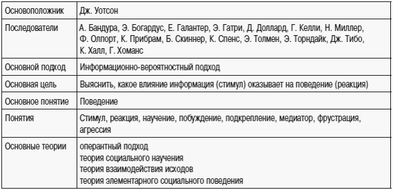 Американский психолог Джон Уотсон (1878—1958) задался целью создать объективную психологию. Он критиковал существовавшее в те годы представление о психологии как об уникальной науке, направленной на исследование сознания только с помощью метода самонаблюдения (интроспекции). Психология, полагал Уотсон, должна использовать те же методы, что и естественные науки. Опираясь на идеи И. П. Павлова, он создал теорию, которую назвал бихевиоризмом. Эта объективная и учитывающая влияние социальной среды точка зрения на долгие годы стала доминирующей в американской психологии. Последователями Уотсона были Э. Торндайк, Э. Толмен (Е. Tolman), Э. Гатри (Е. Guthrie), К. Халл (С. Hull), К. Спенс (К. Spence) и многие другие. Их исследования были в основном направлены на процесс научения (learning), передачи опыта и информации от одного индивида другому (201, с. 542).