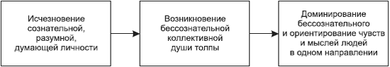 1. Исчезновение сознательной, разумной, думающей личности. «В толпе интеллектуальные способности индивидов исчезают; разнородное утопает в однородном. В толпе может происходить накопление только глупости, а не ума», – утверждал он (88, с. 135).