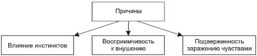Главенствующая роль инстинктов обнаруживается в склонности к произволу, буйству, свирепости, но также в склонности к энтузиазму и героизму, свойственным первобытному человеку. Человек в толпе чрезвычайно легко подчиняется словам и представлениям, не оказывающим на него в изолированном состоянии никакого влияния. В его идеях и чувствах происходят глубокие изменения.Рис. 18.2. Причины трансформации психологических свойств индивидов в толпе по Ле Бону.