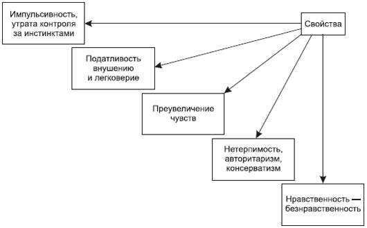 Ле Бон разделял вожаков на две категории. К первой принадлежат люди энергичные, с сильной, но проявляющейся на короткое время волей. Они смелы, буйны и храбры, пригодны для внезапных дерзких предприятий, для того, чтобы увлечь массы на опасность и превратить их в героев. Ко второй категории относятся вожаки, обладающие сильной и стойкой волей. Они встречаются гораздо реже. Среди таких вожаков – основатели религий, творцы великих дел. Умны они или глупы – все равно мир будет принадлежать им. «Их упорная воля представляет такое бесконечно редкое и бесконечно могущественное качество, которое все заставляет себе покоряться. Ничто не может противостоять такой воле – ни природа, ни боги, ни люди» (88, с. 196).Рис. 18.4. Психологические свойства толпы согласно Ле Бону.