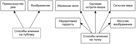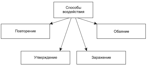 могущественным способом воздействия вожаков является заражение. Все эмоции и действия в толпе быстро становятся заразительными. Этим объясняется, например, распространение паники. Чтобы подчинить себе мир и господствовать над ним, необходимо, помимо сильной воли, обладать еще необыкновенным обаянием. Обаяние – это род господства какой-нибудь идеи или дела над умами людей. Ле Бон выделял два вида обаяния: приобретенное и личное. Приобретенное обаяние достигается титулом, богатством, репутацией. Личное обаяние носит более индивидуальный характер и может совершенно не зависеть от приобретенного обаяния. Обаяние достигается в результате усиленного повторения одних и тех же суждений, мнений, которые никто уже не смеет оспаривать. Личное обаяние достигается путем какого-то магического очарования, действующего на присутствующих. Все великие вожаки толпы – Будда, Магомет, Жанна д\'Арк, Наполеон – обладали именно таким обаянием. Это обаяние сродни харизме, описанной М. Вебером.Рис. 18.5. Способы воздействия вождя на толпу по Ле Бону.