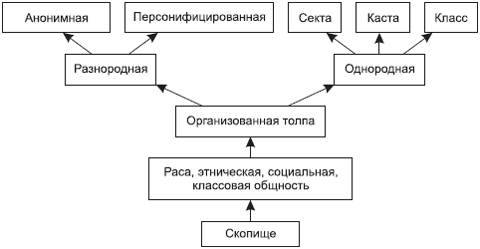 Г. Ле Бон разработал детальную классификацию толпы. Исходной точкой в его классификации служит простое скопище. Оно состоит из людей, принадлежащих к разным этническим и социальным группам, и связано только волей одного вождя. Примером скопища являются варвары, нападавшие на Римскую империю. Второй вид – это толпа, которая приобрела общие черты и образовала расу. Напомним, что под расой Ле Бон понимал этнические, социальные, классовые характеристики. Третий вид – организованная, или одухотворенная, толпа. Организованная толпа в свою очередь делится на два типа. Во-первых, это толпа разнородная, которая может быть анонимной (например, уличная толпа) и персонифицированной (например, присяжные заседатели, парламентские собрания). Во-вторых, существует толпа однородная, которая бывает трех категорий. Первая – это секты, в состав которых входят люди различных профессий и воспитания. Людей в секты объединяют единые верования. К сектам относятся политические партии и религиозные конфессии. Вторая – это касты. Касты составляют военные, духовенство, рабочие. Касты объединяются по профессиональному признаку. Третья – это классы, к которым относятся буржуазия и крестьянство. Класс образуется в силу общих интересов, привычек, возникших под влиянием одинакового образа жизни и воспитания.
