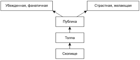 Г. Тард называет этапы формирования толпы. Первый этап – это люди, идущие по улице, каждый по своим делам, просто гуляющие. Эти люди образуют тесное скопище. Второй этап начинается с того момента, как появляется общая цель, которая взволнует и объединит их вместе. Так зарождается первая ступень социального агрегата – толпа. Как только люди увлекутся общей идеей или страстью, они составят публику. В зависимости от того, что перевешивает – цель или желание, возникает два типа публики: публика убежденная, фанатичная, или же публика страстная, желающая.Рис. 18.7. Этапы трансформации толпы по Г. Тарду.