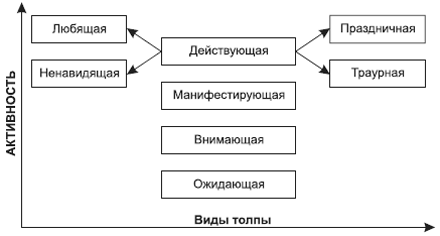 Толпу и публику можно классифицировать также по степени активности. Бывает толпа ожидающая, внимающая, манифестантская и действующая. Для ожидающих толп характерно коллективное любопытство, которое может достигнуть неслыханных размеров вне зависимости от его предмета. Толпа всегда бывает более терпелива или более нетерпелива, чем отдельный индивид. Это объясняется психологической причиной – взаимным заражением эмоциями собравшихся индивидов.