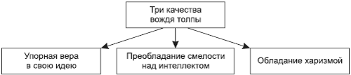 6. Способ управления толпой – это внушение. Потому политика, целью которой является управление массами (партией, классом, нацией), должна опираться на какую-то высшую идею (революции, родины) и внедрять ее в сознание каждого человека посредством внушения.Рис. 18.12. Качества вождя толпы по С. Московичи.