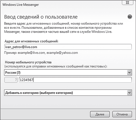 В окне в поле Адрес для мгновенных сообщений нужно ввести электронный адрес добавляемого в список пользователя. Затем нажимаем кнопку Далее. Пользователю будет отправлен запрос на добавление (рис. 3.8).