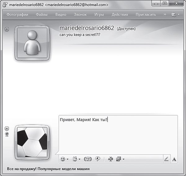 Для отправки сообщений необходимо выбрать пользователя из вашего списка, затем дважды щелкнуть кнопкой мыши на его имени — появится окно, внизу которого находится область для сообщения (рис. 3.9). Поставьте курсор, напечатайте текст, а затем отправьте его нажатием клавиши Enter. Вся переписка (полученные и отправленные сообщения) будет отображена в верхней части окна. Когда человек, с которым вы общаетесь, ответит, его сообщение появится в верхней части этого окна. Мгновенно пользователь сможет написать вам только в том случае, если он находится в режиме Доступен (посмотрите внимательно на окно — там в самом верху указан статус пользователя).