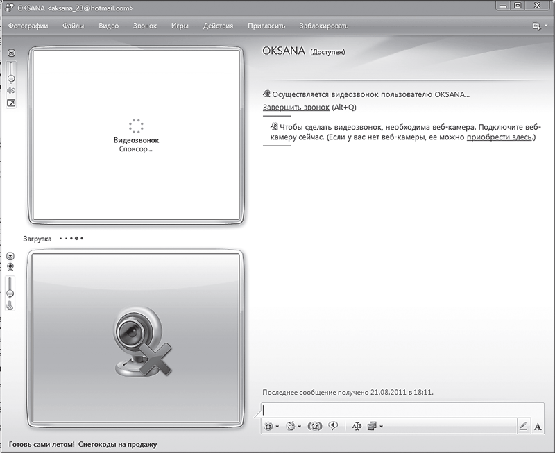Как видите, в пользовании программой нет ничего сложного. Общение может происходить как посредством текстовых сообщений, так и с помощью голоса (кнопка Звонок вверху окна сообщений контакта) и веб-камеры (кнопка Видео). Если ваш собеседник подключил камеру, то рядом с его изображением появится значок Запустить или остановить веб-камеру, нажатие которого позволит отправить запрос о включении камеры (рис. 3.10).