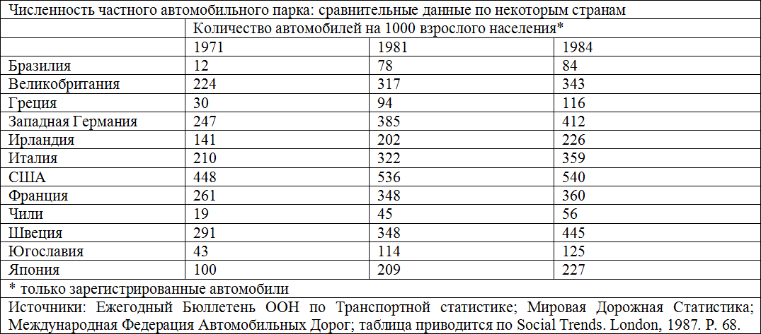 Цифры, приведенные в таблице, позволяют сделать несколько интересных наблюдений. Во-первых, численность автомобильного парка в различных странах существенно варьируется: количество автомобилей на 1000 человек в США почти в десять раз выше, чем в Чили. Во-вторых, таблица обнаруживает прямую связь между численностью личного автомобильного парка и уровнем богатства страны. Фактически мы можем использовать показатели количества имеющихся у населения автомобилей как грубый индикатор относительного благосостояния. В-третьих, во всех представленных странах количество имеющихся у населения автомобилей возросло с 1971 по 1984 год, но в некоторых из них темпы роста выше, чем в других — что, вероятно, указывает степень экономического роста соответствующих стран.