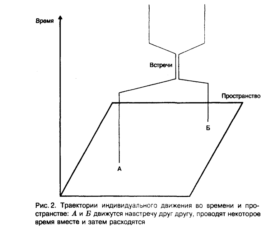 Очень простой пример. Два индивида, назовем их А и Б, живут в разных районах города. Их пространственно-временные пути в указанный день приводят их на определенное время в контакт друг с другом в точке Х — возможно, они встретились в кафе или ресторане, и побеседовали, — после чего пути их расходятся, и каждый занимается своими делами в разных местах. Если зафиксировать эти типичные действия, можно составить “пространственно-временную картину” их жизни. Таким образом, мы можем сложить действия в пространстве и времени в мозаику, которая составляет жизнь городских районов (см. рис.).